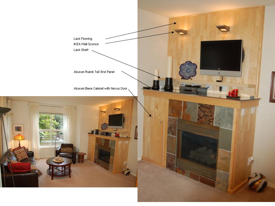 3) Installed an Akurum base cabinet inside the nich to the left of the fireplace. The Nexus birch door matched the cabinets in the adjacent kitchen.