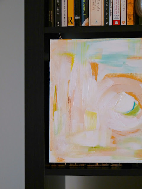 Materials: Ikea Expedit Bookcase, 4 mm screw eyes, 1/2" cup hooks, 12x12 canvases