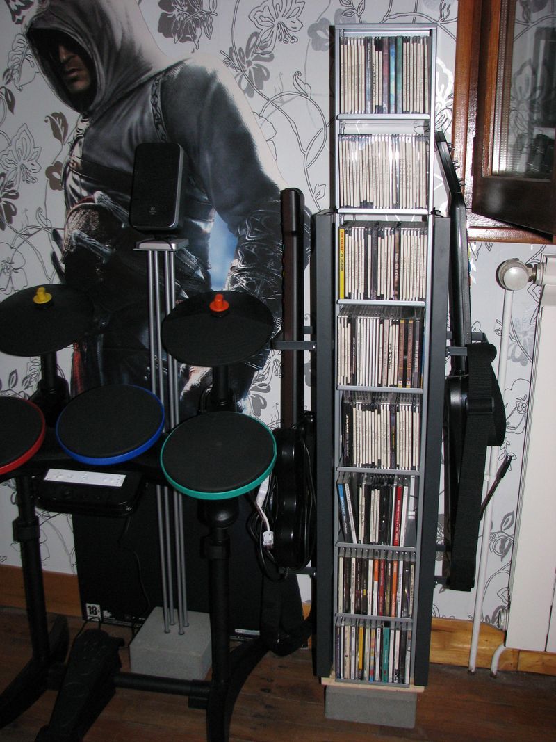 I was looking for a way to store my guitars when not playing Guitar Hero and I figured out they could nicely be hanged alongside my JUTIS CD tower.